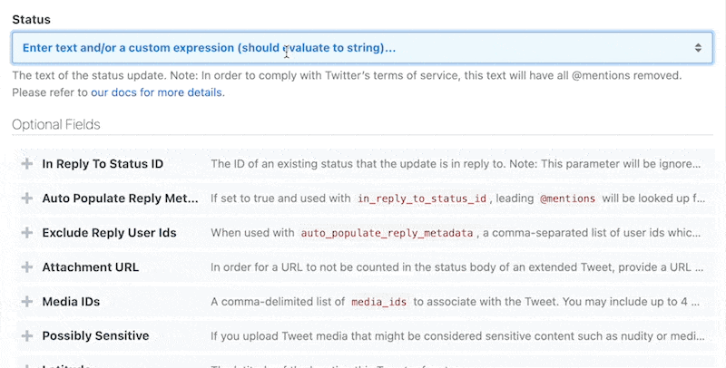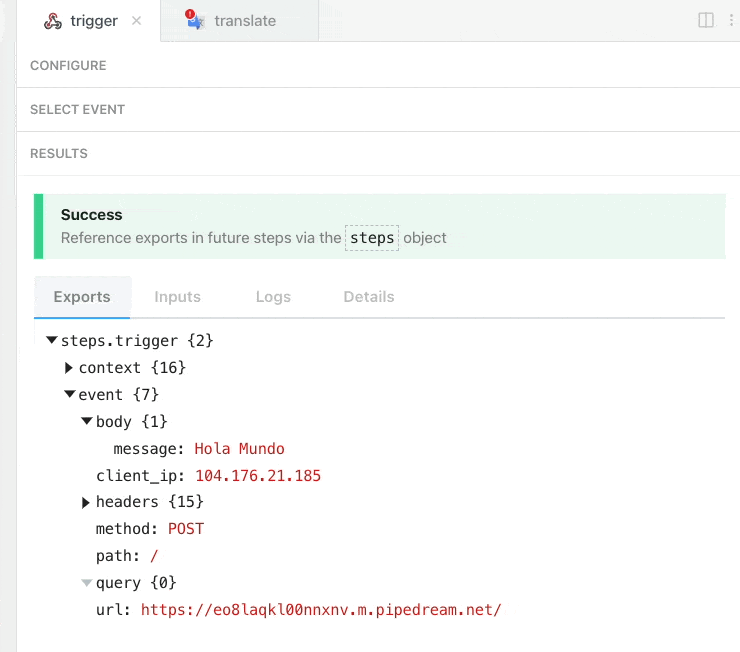 Expressions make it easy to pass data exported from previous steps into a code step or action via props. For example, if your workflow is triggered on new Tweets and you want to send the Tweet content to an HTTP or webhook destination, you would reference{{steps.trigger.event.body}} to do that.