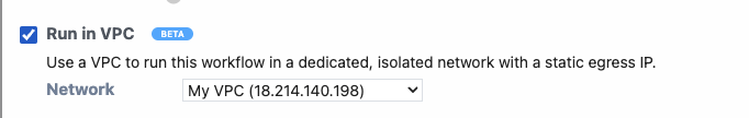 To run workflows in a VPC, check the Run in Private Network option in workflow settings and select the network you created. All outbound network requests for the workflow will originate from the static egress IP for the VPC (both when testing a workflow or when running the workflow in production).