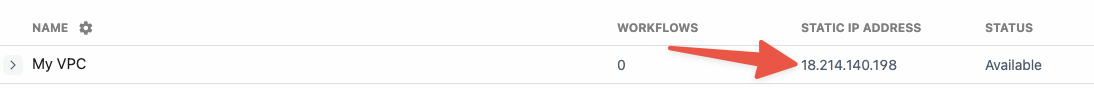 You can view and copy the static outbound IP address for each VPC in your workspace from the Virtual Private Cloud settings. If you need to restrict access to sensitive resources (e.g., a database) by IP address, copy this address and configure it in your application with the/32 CIDR block. Network requests from workflows running in the VPC will originate from this address.